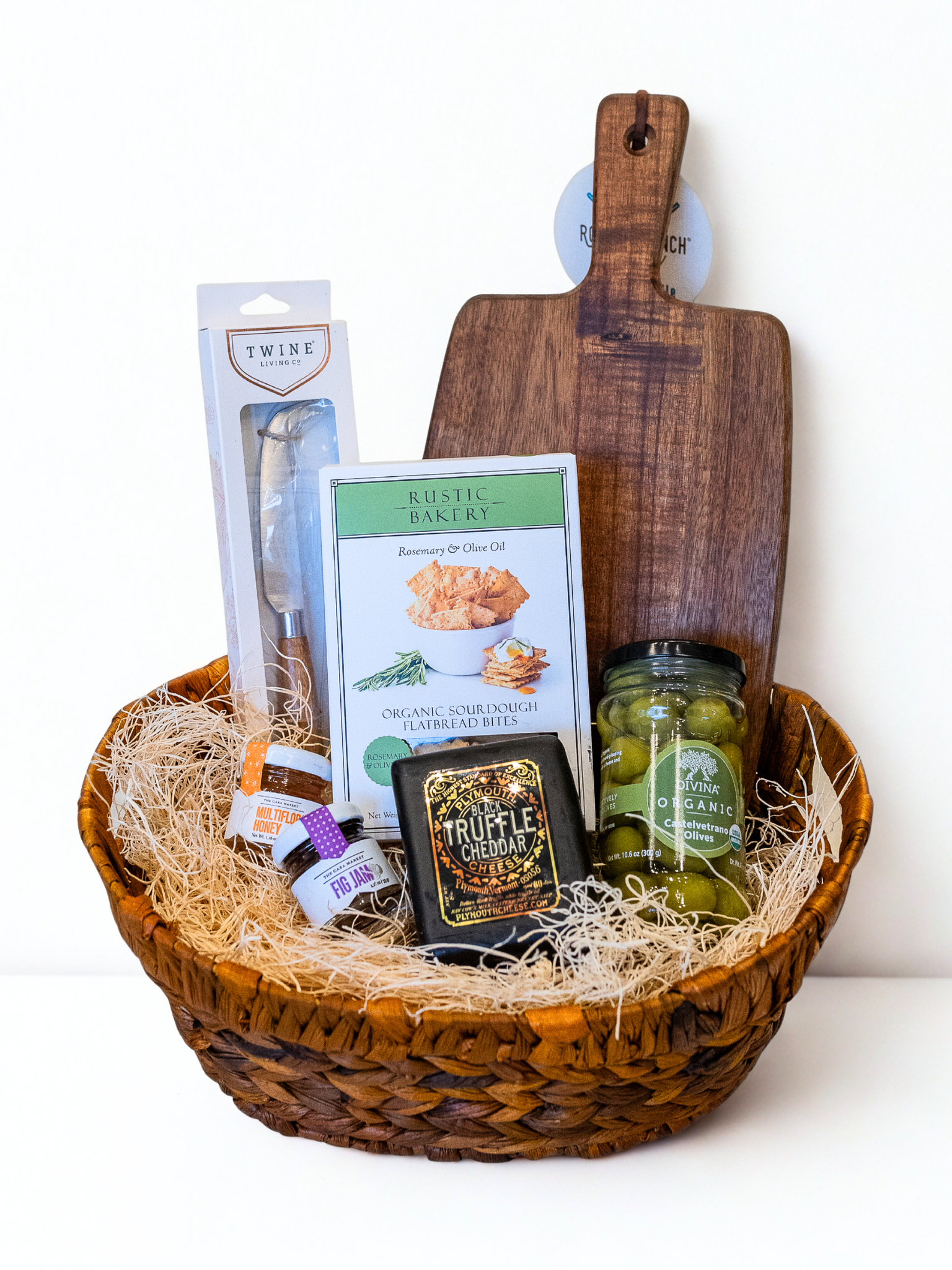 This basket includes an 8.75" Morsel bamboo cheese board with a carved handhold for easy serving, paired with a charcuterie knife for slicing and spreading. To complement your favorite cheeses, we’ve included our favorite Castelvetrano olives, plus two small-batch accompaniments: a mini jar of multiflora honey and a rich, fruit-forward fig jam. A simple, elegant assortment that elevates everyday cheese boards into a full tasting experience.