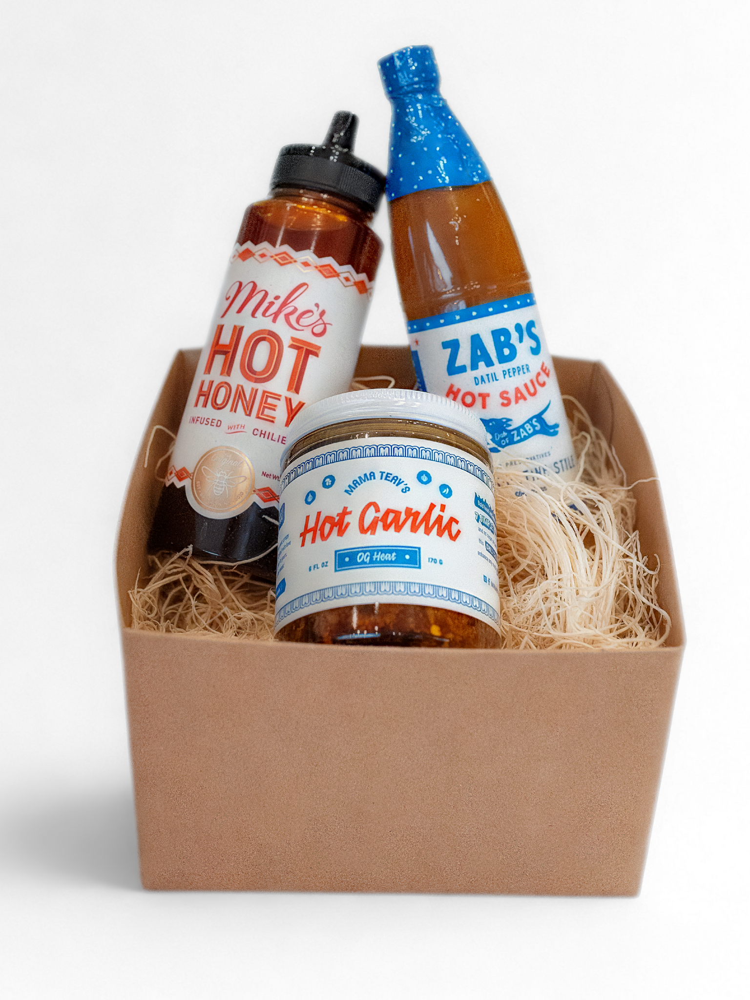 Three heat-forward staples for the spice lover in your life. This collection brings together Mike's Hot Honey, Zab's Hot Sauce, and Mama Teav's Garlic Crisp Oil—everything they need to add a kick to pizza, eggs, noodles, and more.